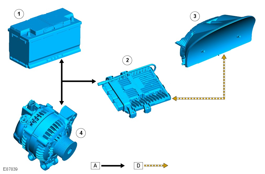 The ECM monitors the generator for mechanical failure or a fault in the connections between the generator and ECM. If a fault is detected a Diagnostic Trouble Code (DTC) is stored in the ECM memory, and if necessary, a message is communicated on the high speed Controller Area Network (CAN) bus to the instrument cluster to illuminate the charge warning indicator lamp. For additional information, refer to: Instrument Cluster (413-01 Instrument Cluster, Description and Operation).