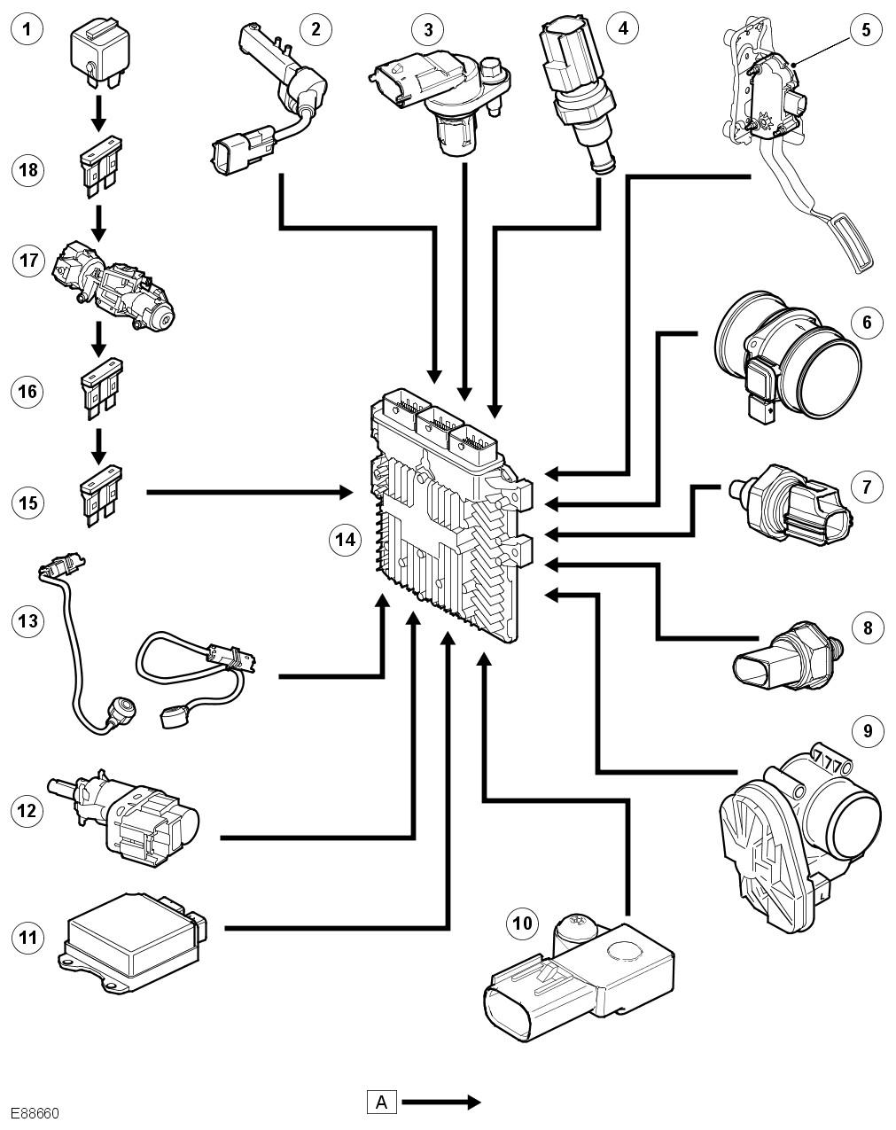 The TDV8 engine has an engine management system controlled by an ECM and is able to monitor, adapt and precisely control the fuel injection. The ECM uses multiple sensor inputs and precision control of actuators to achieve optimum performance during all driving conditions.