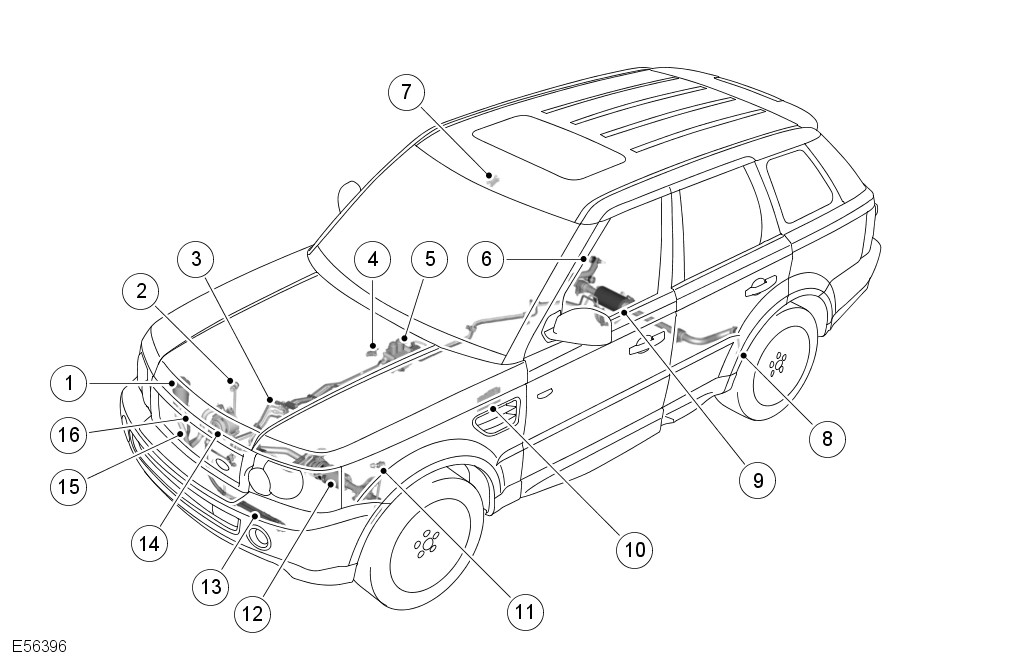 The lower accelerometer is secured to the underside of the vehicle floor, on the RH inner sill panel, below the front door. The upper accelerometer is secured to a bracket on the body roof panel, in a central position at the top of the windscreen.