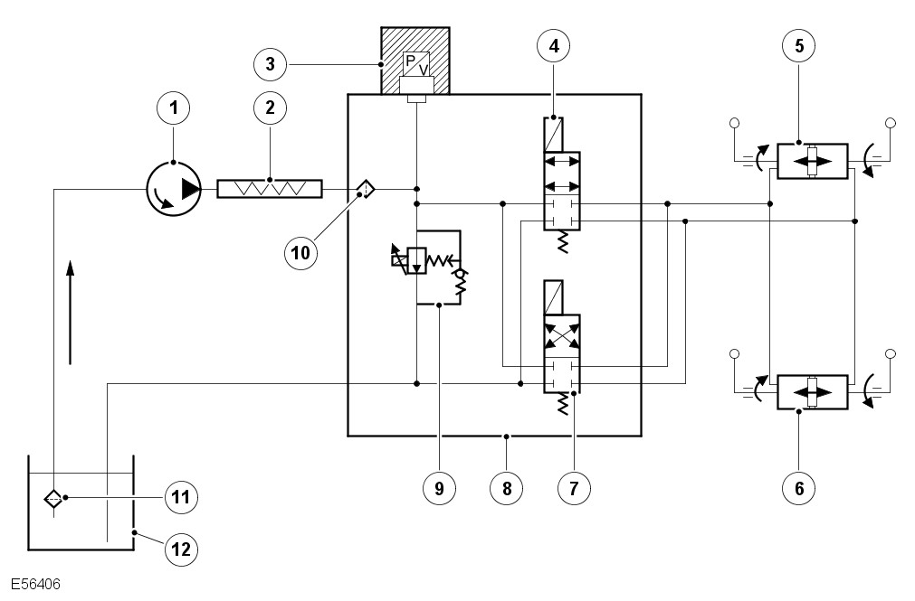When the engine is running and the vehicle is not moving, both DCV's are closed, locking fluid in each side of the actuator piston. The hydraulic pump draws fluid from the reservoir and passes it at very low pressure to the valve block.