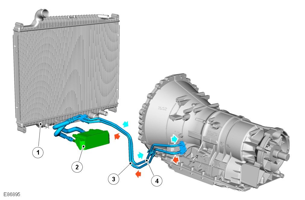 Fluid is supplied from the transmission fluid pump into the Right Hand (RH) connection of the cooler. After passing through the cooler, the fluid passes out of the Left Hand (LH) connection and is returned to the transmission fluid pan.