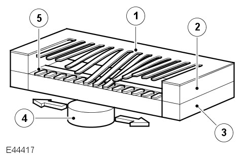 The film resistors are arranged in a linear arc with resistance ranging from 51.2 to 992.11 Ohms. The electrical output signal is output proportional to the amount of fuel in the tank and the position of the float arm. The measured resistance is processed by the instrument cluster to implement an anti-slosh function. This monitors the signal and updates the fuel gage pointer position at regular intervals, preventing constant pointer movement caused by fuel movement in the tank due to cornering or braking.