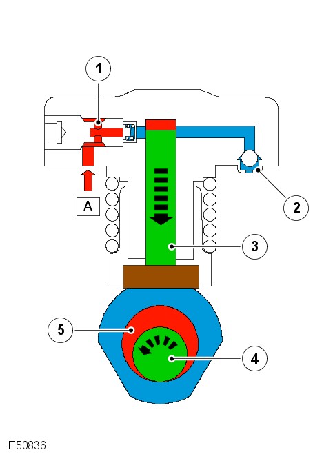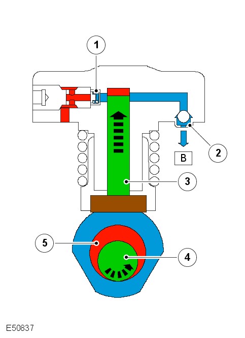The eccentric on the high-pressure fuel pump driveshaft (5) presses the piston (3) upwards. The inlet valve (1) is then closed through the force exerted by the valve spring and the pressure being built up in the pump cylinder. The outlet valve (2) opens when the pressure in the pump cylinder is greater than the fuel pressure in the ring line (B).
