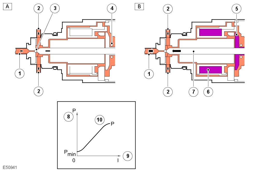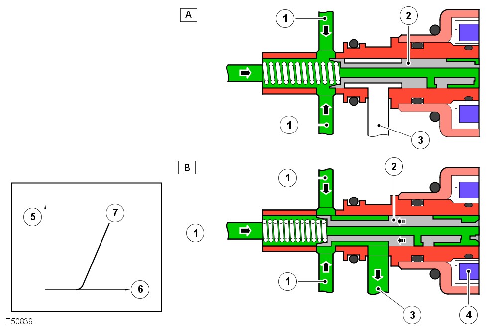 The ECM energizes the coil (4) of the valve, according to the engines requirements. The armature force is proportional to the control current and counteracts the compression spring through the moving piston (2).