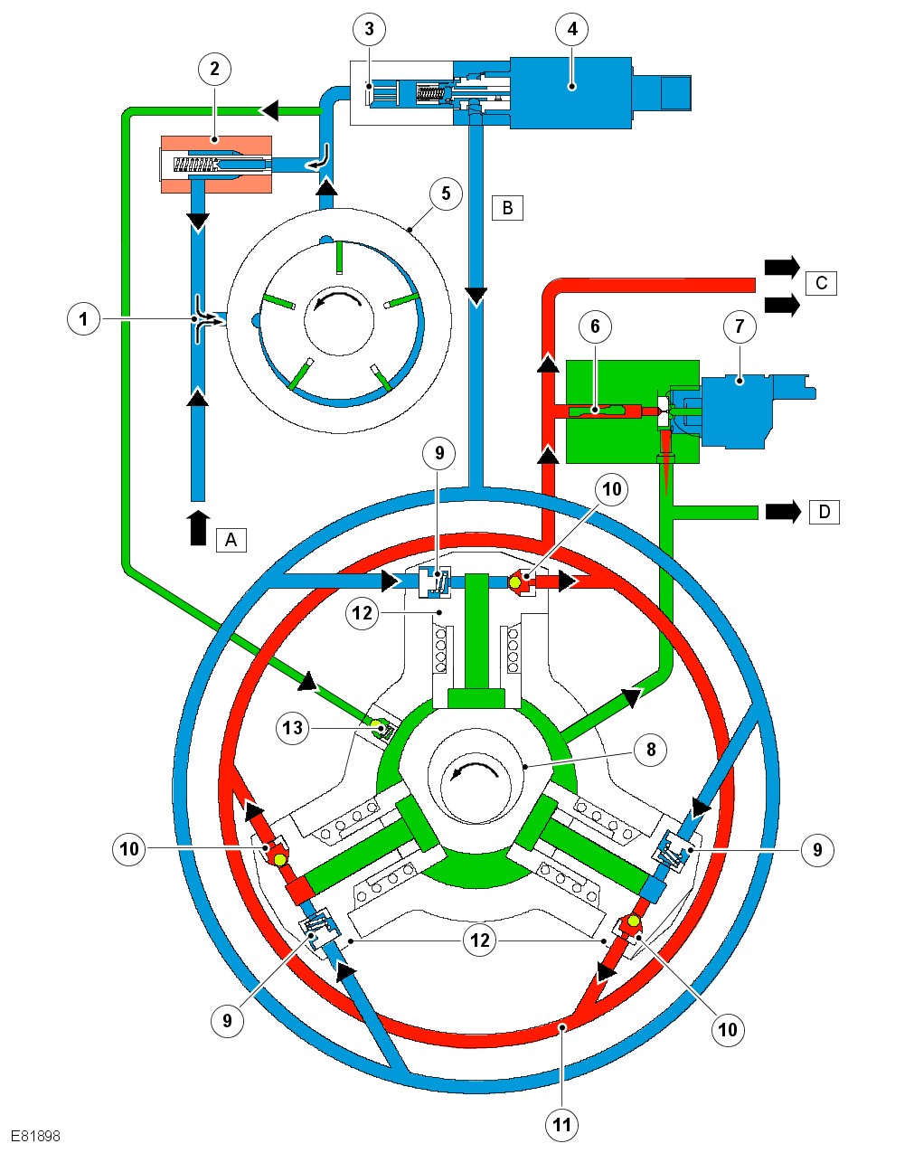 The fuel pressure in the system is reduced within a few seconds after the engine has stopped as the PCV no longer has the holding current it requires, and therefore opens. No residual pressure remains in the system and the fuel is returned to the fuel return line (D) through the open PCV. The system is pressureless.