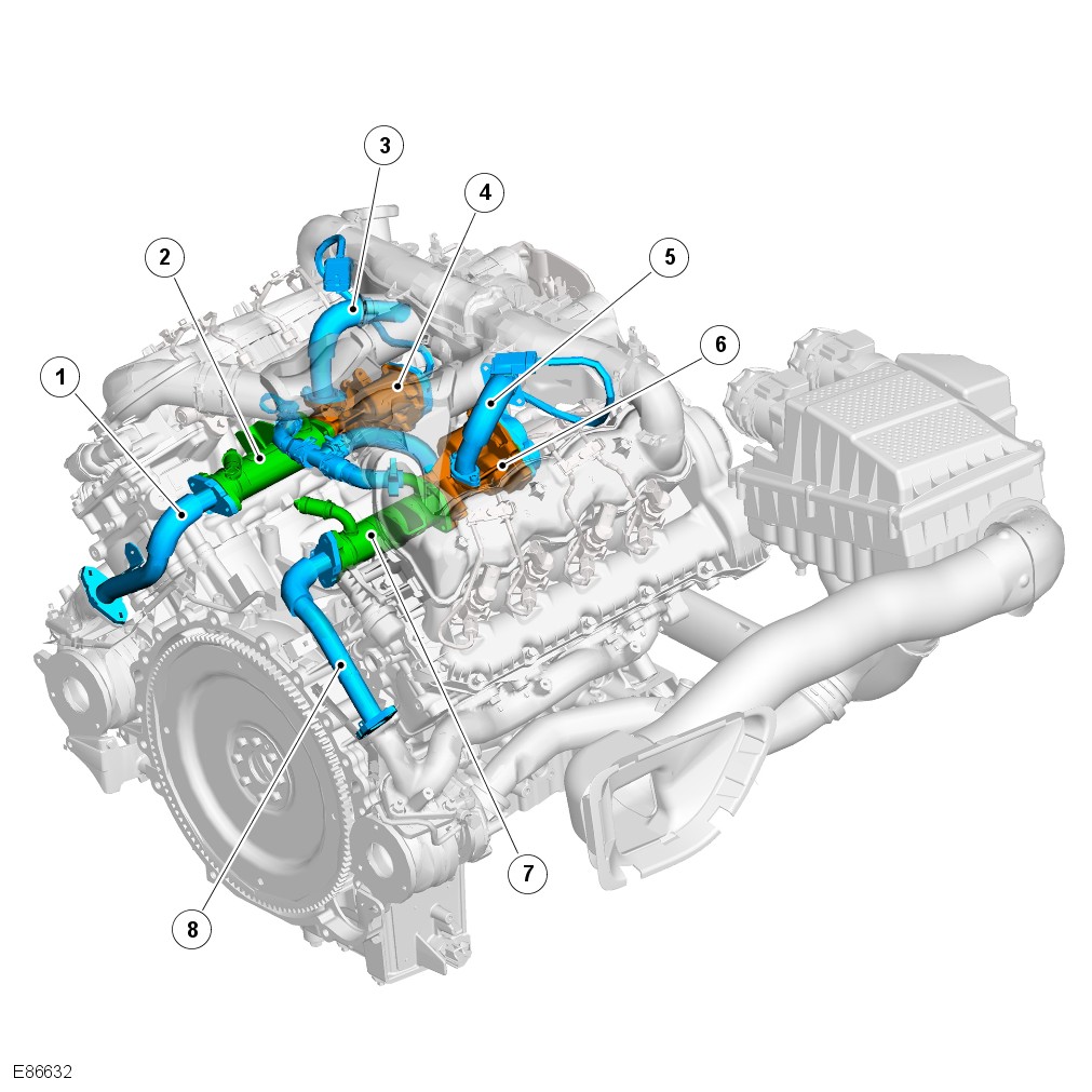The combined EGR modulator and cooler is located between the V of the cylinder banks. The cooler side of the EGR is connected to the vehicle cooling system, via hoses. The inlet exhaust side is connected to the exhaust manifolds on each side via a metal pipe. The exhaust gas passes through the cooler and is expelled via the actuator and a metal pipe into the throttle housing. The EGR modulator is a solenoid operated valve which is controlled by the engine control module (ECM). The ECM uses the EGR modulator to control the amount of exhaust gas being recirculated in order to reduce exhaust emissions and combustion noise. The EGR is enabled when the engine is at normal operating temperature and under cruising conditions.