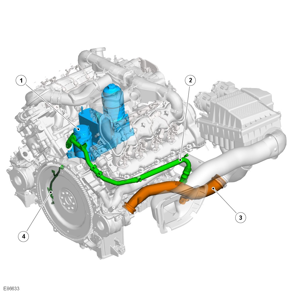 Crankcase gasses are drawn internally into the oil separator unit located in the engine V. The oil separator removes oil from the crankcase gasses. The seperated gas is returned to the inlet side of the air induction system prior to the right-hand (RH) turbo charger. The oil is drained from the separator to the oil pan via an oil return pipe located at the rear of the cylinder block.