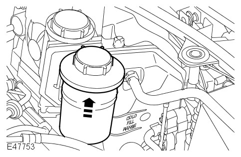 - Add coolant to the expansion tank until the coolant level is 25 mm (0.98 inch) above the "COLD FILL RANGE" upper mark.